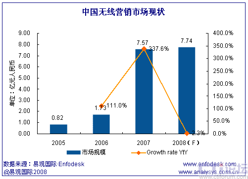 易觀國際(Analysys International)研究發(fā)現(xiàn),中國無線營銷市場經(jīng)過2007年的高速發(fā)展后,2008年已經(jīng)進(jìn)入了商業(yè)模式探索階段,從市場規(guī)模上看,2008年全年無線營銷市場規(guī)模僅比上年增長2.3%。易觀國際(Analysys International)認(rèn)為,無線營銷市場增速的明顯放緩主要由于短信廣告市場的萎縮,短信廣告是無線營銷市場最大的細(xì)分領(lǐng)域,2007年曾經(jīng)占整個無線營銷市場規(guī)模的72.7%。