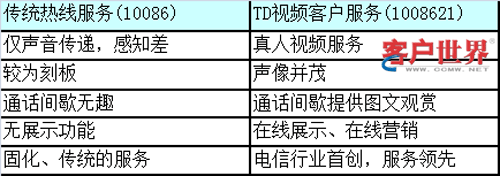 TD視頻客服與傳統(tǒng)語音熱線服務(wù)相比,最大區(qū)別在于可通過“面對面”方式向客戶提供相關(guān)服務(wù),具備“服務(wù)”和“體驗(yàn)”兩大特點(diǎn)。視頻客服在服務(wù)內(nèi)涵、內(nèi)容等方面有較大的深化與突破空間,是多媒體呼叫中心服務(wù)手段的一種有效形式之一。