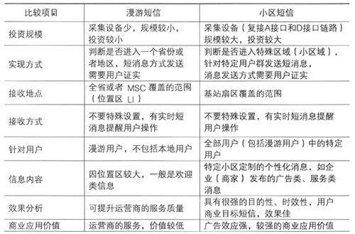 兩個(gè)系統(tǒng)最大的不同點(diǎn)是接收短信的范圍和用戶不一樣,漫游短信是針對(duì)漫游用戶在一個(gè)相對(duì)較大區(qū)域內(nèi),因此只適合運(yùn)營(yíng)商發(fā)一般性的問(wèn)候短信,提高運(yùn)營(yíng)商的服務(wù)質(zhì)量;小區(qū)短信則是在一個(gè)較小的區(qū)域內(nèi)(特定地點(diǎn)),針對(duì)特定用戶(可能包括漫游用戶),在一個(gè)特定的時(shí)間,發(fā)送特定的消息,因此這種消息具有較強(qiáng)的針對(duì)性,具有較高的商業(yè)用戶價(jià)值,可用于企業(yè)(商家)發(fā)布廣告和服務(wù)類的信息,能夠成為一種典型的增值服務(wù)。