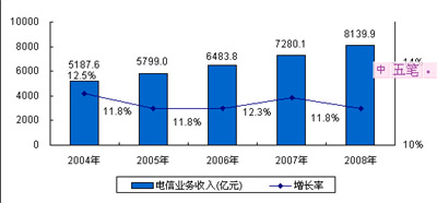 圖1 2004-2008年中國(guó)電信業(yè)務(wù)收入及增長(zhǎng)情況