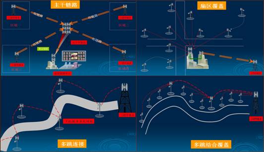 在無線主干鏈路的基礎(chǔ)上,可以從干路節(jié)點(diǎn)延伸到任何一條小路形成支路系統(tǒng)。BITWAVE的支路系統(tǒng)采用點(diǎn)對點(diǎn)多跳技術(shù)或者點(diǎn)對多點(diǎn)技術(shù)進(jìn)行分支的延伸。如果支路下面監(jiān)控節(jié)點(diǎn)比較多,則可以采用無線聚合技術(shù)提高支路的帶寬。下面提供4種設(shè)計方案供參考,具體選擇哪種要根據(jù)現(xiàn)場的實(shí)際環(huán)境綜合考慮。