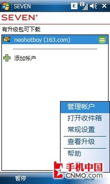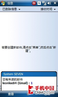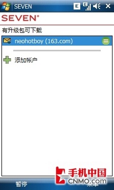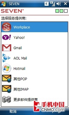 當有新郵件時,SEVEN就會提示用戶有未讀郵件,真正做到了即時收取,彌補了WM系統(tǒng)的不足,對于眾多需要隨時收發(fā)郵件的白領(lǐng)來說非常貼心。不過,SEVEN只能添加3個郵件帳戶,看來郵件狂人只能根據(jù)郵箱的重要性,選擇性的使用Push功能了。