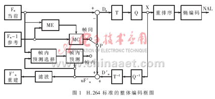 Abstraction Layer),負(fù)責(zé)對(duì)數(shù)據(jù)進(jìn)行打包和傳送。H.264編碼圖像通常分為三種類型:I幀、P幀、B幀。I幀為幀內(nèi)編碼幀,其編碼不依賴于已編碼的圖像數(shù)據(jù)。P幀為前向預(yù)測(cè)幀,B幀為雙向預(yù)測(cè)幀,編碼時(shí)都需要根據(jù)參考幀進(jìn)行運(yùn)動(dòng)估計(jì)。同時(shí),H.264在提高圖像傳輸容錯(cuò)性方面做了大量工作,重新定義了適于圖像的結(jié)構(gòu)劃分。在編碼時(shí),圖像幀各部分被劃分到多個(gè)Slice結(jié)構(gòu)中,每個(gè)Slice都可以被獨(dú)立編碼,不受其他部分影響。Slice由圖像最基本的結(jié)構(gòu)——宏塊組成,每個(gè)宏塊包含一個(gè)16×16的亮度塊和兩個(gè)8×8的色度塊。H.264標(biāo)準(zhǔn)的整體編碼框圖如圖1所示。編碼過程中,原始數(shù)據(jù)進(jìn)入編碼器后,當(dāng)采用幀內(nèi)編碼時(shí),首先選擇相應(yīng)的幀內(nèi)預(yù)測(cè)模式進(jìn)行幀內(nèi)預(yù)測(cè),隨后對(duì)實(shí)際值和預(yù)測(cè)值之間的差值進(jìn)行變換、量化和嫡編碼,同時(shí)編碼后的碼流經(jīng)過反量化和反變換之后重構(gòu)預(yù)測(cè)殘差圖像,再與預(yù)測(cè)值相加得出重構(gòu)幀,得出的結(jié)果經(jīng)過去塊濾波器平滑后送入幀存儲(chǔ)器。采用幀間編碼時(shí),輸入的圖像塊首先在參考幀中進(jìn)行運(yùn)動(dòng)估計(jì),得到運(yùn)動(dòng)矢量。運(yùn)動(dòng)估計(jì)后的殘差圖像經(jīng)整數(shù)變換、量化和嫡編碼后與運(yùn)動(dòng)矢量一起送入信道傳輸。同時(shí)另一路碼流以相同的方式重構(gòu)后,經(jīng)去塊濾波后送入幀存儲(chǔ)器作為下一幀編碼的參考圖像。