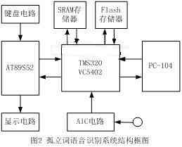此語(yǔ)音識(shí)別系統(tǒng)的目的讓機(jī)器人能聽(tīng)懂我們所發(fā)出的簡(jiǎn)單的命令,首先由TLC320AD50C采集計(jì)算機(jī)聲卡的語(yǔ)音,經(jīng)過(guò)轉(zhuǎn)換后送給TMS320VC5402, TMS320VC5402完成語(yǔ)音信號(hào)處理,即識(shí)別出所發(fā)出的語(yǔ)音,然后把結(jié)果送給AT89S52顯示,同時(shí)通過(guò)串行通訊送給機(jī)器人(PC-104),以使機(jī)器人能夠控制自己的行動(dòng)。其結(jié)構(gòu)框圖如圖2所示。