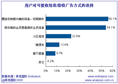 從用戶對短信廣告的接受程度來看,用戶對于自己感興趣領(lǐng)域的短信廣告并不反感,甚至樂于接受或定制。根據(jù)易觀國際Enfodesk發(fā)布的用戶調(diào)研數(shù)據(jù),56.1%的用戶愿意定制自己感興趣的信息,54.1%的用戶愿意接受會(huì)員信息,只有8.7%的用戶不愿意接受任何形式的短信/彩信廣告。但是這類用戶樂于接受的短信廣告反而一般有固定的端口號(hào),更容易被攔截,因此易觀國際(Analysys