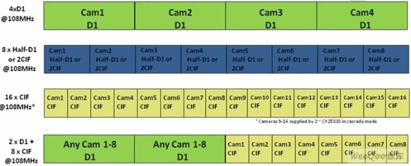 CX25838為監(jiān)控DVR設計人員提供機會,通過提供幀交錯數(shù)據(jù)實現(xiàn)編解碼器效率最大化,而不采用昂貴的FPGA或可編程邏輯。它還通過提供各種分辨率和幀速率,在一系列產品*享系統(tǒng)架構,提供規(guī)模優(yōu)勢的能力。例如,低成本DVR可采用一個編解碼器以全幀速率壓縮16個CIF分辨率通道,這可通過一條8位總線實現(xiàn)。其他解決方案可能需要每個編解碼器以全幀速率壓縮4個D1分辨率通道。還有些可能需要降低幀速率的D1