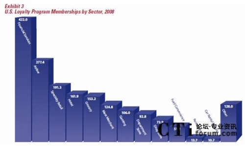 在美國,忠誠度營銷應該用為廣泛的五個行業(yè)/領域是金融服務(銀行、保險、證券、基金等)、航空、專門零售(例如各類的專賣店、品牌連鎖)、酒店及百貨。值得一提的是,近兩年來,金融服務行業(yè)在忠誠度營銷的應用發(fā)展迅速,各類忠誠度計劃的參與人數(shù)由2006年的2.388億上升到2008年的4.22億,這個增長主要是由各類具備信用卡、借記卡功能的聯(lián)名卡發(fā)行所致。
