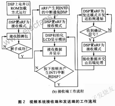 在視頻流傳輸過程中,nRF24LOl可以同時監(jiān)聽空中信號并自動應答。若收到來自接收端的拍照通知(按下按鈕),則把OV9640設定為標準拍攝模式,分辨率為l280×960(@8bit)。然后,DSP將nRF24L01設定為發(fā)送模式,并將此時的幀數(shù)據(jù)發(fā)送出去。圖像數(shù)據(jù)發(fā)送完成并等到接收確認信號后,系統(tǒng)將重新回到視頻流模式。若接收不成功,則nRF24LOl的自動重發(fā)功能將確保數(shù)據(jù)傳輸?shù)耐暾浴?br />