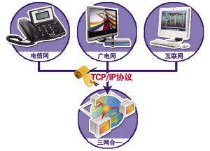 所謂三網(wǎng)融合,就是在同一個(gè)網(wǎng)上實(shí)現(xiàn)語(yǔ)音、數(shù)據(jù)和圖像的傳輸。對(duì)用戶而言,就是指只用一條線路可以實(shí)現(xiàn)打電話、看電視、上網(wǎng)等多種功能。
