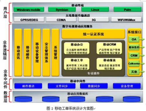 移動(dòng)工單系統(tǒng)是在Windows Mobile智能手機(jī)操作系統(tǒng)上自主研發(fā),采用B/S和C/S混合架構(gòu),以TCP/IP作為基礎(chǔ)數(shù)據(jù)傳輸協(xié)議,通過移動(dòng)通信網(wǎng)絡(luò)無(wú)線數(shù)據(jù)通道GPRS/EDGE/CDMA1x等,將呼叫中心的工單數(shù)據(jù)推送到智能手機(jī)上,由外勤服務(wù)人員將服務(wù)情況進(jìn)行實(shí)時(shí)的反饋。利用的同步中間件可將最新的資訊文件推送到手機(jī)終端上,服務(wù)人員無(wú)需登錄即可在終端可以查看最新的廣電資訊,可支持doc、xls、ppt等 Office文檔格式的瀏覽,支持WMV、WAV、3GP多種音視頻文件播放。服務(wù)人員可以不受地點(diǎn)和時(shí)間的限制通過終端實(shí)時(shí)獲取最新的多媒體客戶交互中心運(yùn)營(yíng)數(shù)據(jù)報(bào)表,圖2為系統(tǒng)設(shè)計(jì)方案圖。