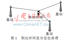 TDOA定位技術(shù)是根據(jù)不同基站接收到的同一移動(dòng)終端信號(hào)在傳輸路徑上的時(shí)延差異實(shí)現(xiàn)終端定位。當(dāng)移動(dòng)終端發(fā)出緊急呼叫時(shí),移動(dòng)網(wǎng)絡(luò)通過(guò)其附近的三個(gè)或更多個(gè)不同基站接收并測(cè)量出信號(hào)的到達(dá)時(shí)間,網(wǎng)絡(luò)計(jì)算出到達(dá)時(shí)間兩兩之間的差值,移動(dòng)終端必然位于這些時(shí)間差值所對(duì)應(yīng)的以?xún)蓛苫緸榻裹c(diǎn)的雙曲線(xiàn)上[2]。這樣,根據(jù)兩條雙曲線(xiàn)的交點(diǎn)就能夠確定手機(jī)的位置。所以只要附近三個(gè)基站接收到移動(dòng)終端發(fā)出的信號(hào)就可以達(dá)到定位目的。TDOA技術(shù)只需要移動(dòng)通信網(wǎng)絡(luò)參與網(wǎng)絡(luò)參數(shù)的測(cè)量,不需要對(duì)終端硬件上的改動(dòng)。因此實(shí)現(xiàn)TDOA定位只需要在移動(dòng)通信網(wǎng)中增加相應(yīng)功能模塊就可以了,并支持所有廠(chǎng)商生產(chǎn)的移動(dòng)終端。同時(shí)它具有定位精度高、響應(yīng)時(shí)間短、實(shí)現(xiàn)簡(jiǎn)單等優(yōu)點(diǎn)。
