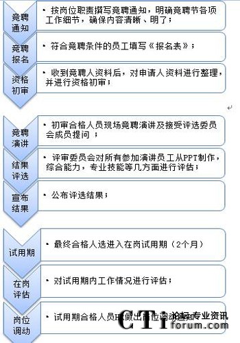 為營造公開、公平、公正的內(nèi)部人才選拔環(huán)境,使符合條件的員工均有參與的機會和權(quán)利,內(nèi)部選拔人才一般采用競聘模式。下圖為參考流程: