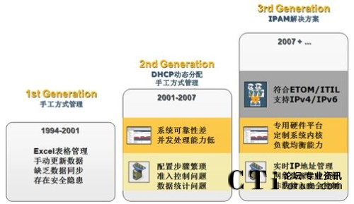 新一代網(wǎng)絡核心服務自動化管理支撐平臺能自動、有效地管理訪問網(wǎng)絡的IP/MAC 資源,實時提供更新數(shù)據(jù),控制未授權IP/MAC地址訪問網(wǎng)絡,從而提高內(nèi)部網(wǎng)絡的可管理性和安全性。下圖是網(wǎng)絡核心服務解決方案的所經(jīng)歷的發(fā)展階段: