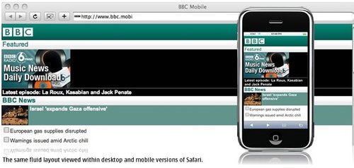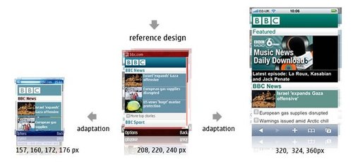 BBC還可以為特定的設(shè)備(或是一組設(shè)備)重新編排一些內(nèi)容。iPhone有非常豐富的功能,因此iPhone版的BBC還有音樂下載選項(xiàng),而其他的設(shè)備可能只會顯示今天最熱門的‘BBC新聞’。可以根據(jù)數(shù)據(jù)的大小,多媒體的處理能力甚至是屏幕的尺寸決定是否需要針對iPhone提供更加豐富的內(nèi)容。以Nokia 6680上的‘特色’顯示為例,它大部分的顯示內(nèi)容是讓用戶滾動(dòng)屏幕查看今天最熱門新聞故事。iPhone上顯示了三個(gè)新聞故事,而其中只有一篇配有插入。這使得用戶無需滾動(dòng)屏幕就可以大致了解全部的咨詢。