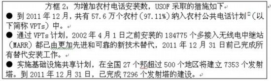 農(nóng)村電話(huà)安裝數(shù)從2007年3月的4710萬(wàn)增加到2011年3月的2億8229萬(wàn),2011年12月達(dá)到3億1539萬(wàn)。農(nóng)村電話(huà)數(shù)占全國(guó)電話(huà)總數(shù)的比例也從2007年的22.88%增加到2011年12月的34.04%。移動(dòng)電話(huà)數(shù)量對(duì)農(nóng)村電話(huà)總數(shù)的增加貢獻(xiàn)很大。移動(dòng)電話(huà)在農(nóng)村電話(huà)總數(shù)中的比重從2007年3月的73.33%提高到2011年3月的96.90%,到2011年12月達(dá)到97.53%。2011-2012年(到12月)期間,農(nóng)村電話(huà)數(shù)量的增長(zhǎng)率為11.73%,而城市電話(huà)用戶(hù)增長(zhǎng)率則為8.35%。個(gè)人用戶(hù)是農(nóng)村電話(huà)數(shù)增加的主要推動(dòng)力,個(gè)人用戶(hù)占農(nóng)村電話(huà)總數(shù)的比重從2007年的51.87%上升到2011年2月的86.78%。為了增加農(nóng)村電話(huà)安裝總數(shù),USOF采取了以下措施,請(qǐng)見(jiàn)方框2所示。