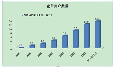去年進(jìn)行的3G/BWA牌照拍賣(mài)有望成為一個(gè)催化劑,將寬帶接入擴(kuò)展到印度最偏遠(yuǎn)的地方。印度電信市場(chǎng)正在經(jīng)歷“信息革命”。為了促進(jìn)寬帶的普及,政府已經(jīng)公布并實(shí)施了多項(xiàng)政策(見(jiàn)方框3)。得益于這些政策的實(shí)施,寬帶用戶(hù)數(shù)從2005年的18萬(wàn)增加到2011年3月的1187萬(wàn),2011年底達(dá)到1330萬(wàn)。