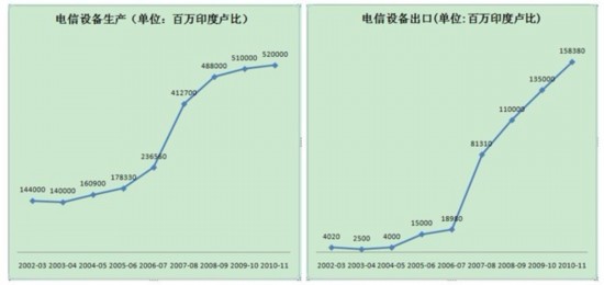 印度并不滿(mǎn)足于僅成為制造業(yè)中心,還計(jì)劃擴(kuò)大出口。2006-2007年,印度電信設(shè)備出口總價(jià)值約為189.8億盧比,到2010-2011年,這一數(shù)字增加到1583.8億,增長(zhǎng)了730%。