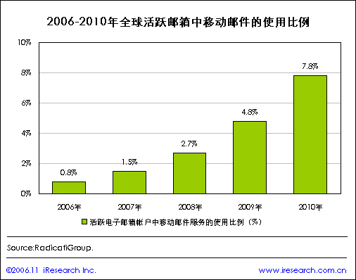 iResearch艾瑞市場咨詢根據(jù)市場咨詢公司RadicatiGroup公布的調(diào)查結(jié)果整理顯示,在2006年全球活躍電子郵箱賬號中有0.8%使用移動電子郵件服務,移動電郵將會逐漸為高端用戶所接受,RadicatiGroup預計到2010年活躍電子郵箱賬號中使用移動電郵服務的比例將達到7.8%.