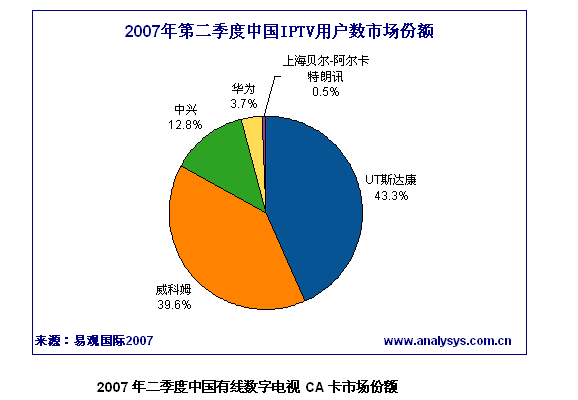 易觀國(guó)際研究表明,2007年第2季度中國(guó)IPTV用戶(hù)數(shù)達(dá)到73.6萬(wàn),根據(jù)各廠商中標(biāo)業(yè)務(wù)區(qū)實(shí)際發(fā)展的用戶(hù)數(shù)排名,UT斯達(dá)康占據(jù)第一,河南廠商威科姆占據(jù)第二,中興通訊位居第三。