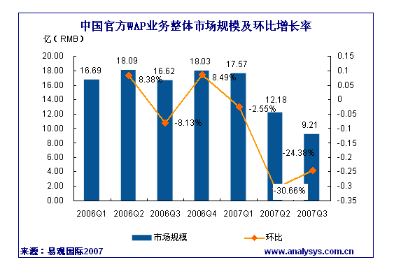 易觀國際研究表明,2007年第3季度中國官方WAP市場規(guī)模達(dá)到9.21億人民幣,同比下降44.57%。中國移動WAP頁面“資費(fèi)提醒”政策對市場的影響已得到控制,與2季度WAP市場規(guī)模逐月遞減現(xiàn)象相比,2007年7月、8月、9月WAP市場規(guī)模呈現(xiàn)穩(wěn)步增長趨勢。中國聯(lián)通WAP市場規(guī)模為1.065億元,同比下降47.55%,自中國聯(lián)通四月份改實(shí)收結(jié)算后,信息費(fèi)一直呈現(xiàn)下降趨勢。