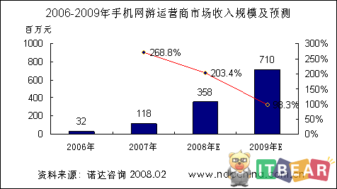 諾達(dá)咨詢報告《2008手機網(wǎng)游報告—產(chǎn)業(yè)發(fā)展與競爭策略》認(rèn)為,手機網(wǎng)絡(luò)游戲已經(jīng)過了市場導(dǎo)入期,在未來幾年將步入快速發(fā)展階段。咨詢研究數(shù)據(jù)表明,2007年手機網(wǎng)游市場運營收入達(dá)到了1.18億元人民幣,今年將達(dá)3.58億元人民幣,到2009年市場規(guī)模有望突破7.0億元人民幣。