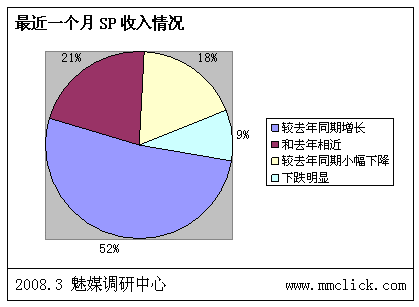 最近公布的空中網(wǎng)財(cái)務(wù)報(bào)表的數(shù)據(jù)顯示空中網(wǎng)總收入環(huán)比增長,結(jié)合之前廣東移動(dòng)推出:廣東移動(dòng)向重服務(wù)轉(zhuǎn)變 首推“6+1”服務(wù),SP行業(yè)可以說是暖風(fēng)頻吹。魅媒無線行業(yè)調(diào)研中心隨機(jī)從3月3日到3月5日隨記電話采訪50多家全網(wǎng)以及廣東省網(wǎng)SP公司相關(guān)負(fù)責(zé)人,對最近的SP行業(yè)的政策調(diào)整進(jìn)行調(diào)查,有以下的數(shù)據(jù):