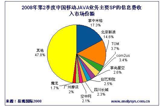 易觀(guān)國(guó)際近期發(fā)布《2008年第2季度中國(guó)手機(jī)游戲市場(chǎng)季度監(jiān)測(cè)》顯示:中國(guó)移動(dòng)JAVA業(yè)務(wù)SP信息費(fèi)方面,掌中米格、北京新浪分居前兩名,兩者市場(chǎng)占有率已提高至31.9%。其中掌中米格信息費(fèi)季度收入達(dá)到2505.86萬(wàn)元,市場(chǎng)占比為17.3%,而新浪信息費(fèi)收入市場(chǎng)占比為14.6%。信息費(fèi)收入的第3至第5名依次為T(mén)OM、com2us、掌尚星空,三者總市場(chǎng)占比為9.7%。