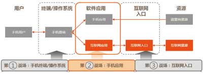 在楊俊看來,應(yīng)用商店的到來改變了傳統(tǒng)模式。例如,開放的互聯(lián)網(wǎng)模式推倒了原來的花園圍墻,手機(jī)軟件類型從單機(jī)應(yīng)用走向在線應(yīng)用,手機(jī)軟件來源從內(nèi)置型轉(zhuǎn)向用戶自主下載、自定制和自安裝。最重要的是,各大廠商不僅滿足于應(yīng)用商店這一畝三分地,而是把觸角延伸到了產(chǎn)業(yè)鏈上的各個(gè)環(huán)節(jié),由此形成了三個(gè)主要戰(zhàn)場(chǎng):手機(jī)終端及操作系統(tǒng)、手機(jī)應(yīng)用、互聯(lián)網(wǎng)入口,具體見圖所示。
