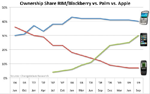 ChangeWave Research今年9月對4255名美國用戶進行的調(diào)查顯示,其中39%擁有智能手機,高于7月的37%,較去年同期幾乎翻番。雖然RIM黑莓仍然占據(jù)榜首,但是其市場份額增長已經(jīng)開始停滯,目前約為40%,與去年同期基本持平,而iPhone則保持了快速上升勢頭,由去年同期的不足20%,增長到現(xiàn)在的30%。