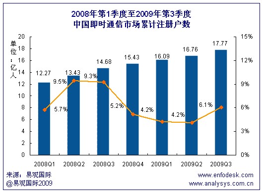 根據(jù)易觀國際Enfodesk產業(yè)數(shù)據(jù)庫即將發(fā)布的《2009年第3季度中國即時通信市場季度監(jiān)測》數(shù)據(jù)顯示,2009年第3季度中國即時通訊市場累計注冊賬戶數(shù)達到17.77億,環(huán)比增長6.1%,同比增長21%。