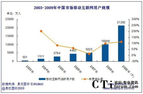 2009年中國(guó)市場(chǎng)移動(dòng)互聯(lián)網(wǎng)行業(yè)收入規(guī)模將達(dá)388億,年增長(zhǎng)率達(dá)111.78%。