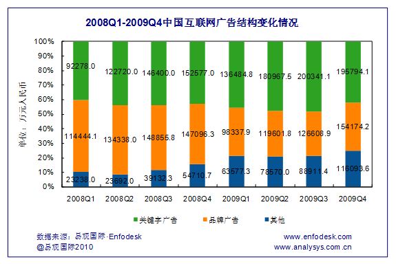 品牌廣告則繼續(xù)保持上升趨勢(shì),2009年第4季度,其市場(chǎng)規(guī)模達(dá)到15.4億元,環(huán)比增長(zhǎng)21.8%,同比小幅上升4.8%。增長(zhǎng)來(lái)源主要是快消品、互聯(lián)網(wǎng)產(chǎn)品及服務(wù)以及汽車、通訊行業(yè)等。