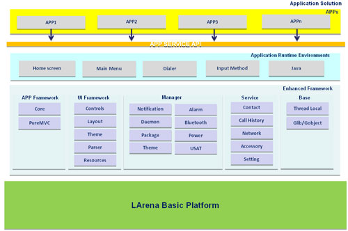 LARENA3.0是聯(lián)芯科技自主研發(fā)的高度可配置、可擴(kuò)展、開放性的業(yè)內(nèi)主流手機(jī)應(yīng)用平臺,它集通信、多媒體和移動互聯(lián)網(wǎng)功能于一體,實(shí)現(xiàn)了完整的應(yīng)用生命周期管理和動態(tài)加載能力,充分體現(xiàn)了TD-SCDMA特有創(chuàng)新技術(shù),并支持多種業(yè)務(wù)能力,提供豐富的工具套件。