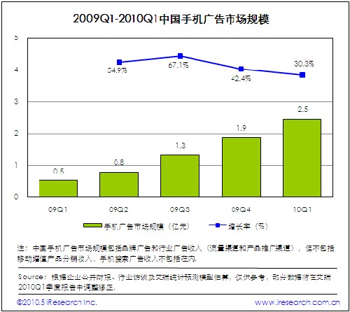 2010Q1中國手機(jī)廣告市場規(guī)模達(dá)到2.5億,環(huán)比增長30.3%.受季節(jié)性因素影響,手機(jī)廣告市場增速放緩,但是保持增長發(fā)展態(tài)勢。本季度,新聞、體育、數(shù)碼、女性和汽車類手機(jī)廣告市場表現(xiàn)良好,文本、橫幅、全屏以及客戶端軟件等手機(jī)廣告形式受到廣告主青睞。針對不同受眾群體進(jìn)行多重定向廣告營銷成為更多手機(jī)廣告服務(wù)提供商的實踐方向。盡管本季度手機(jī)廣告市場取得良好的市場表現(xiàn)力,但是廣告定價和廣告效果評估等制約手機(jī)廣告市場發(fā)展的關(guān)鍵因素仍將長期存在。