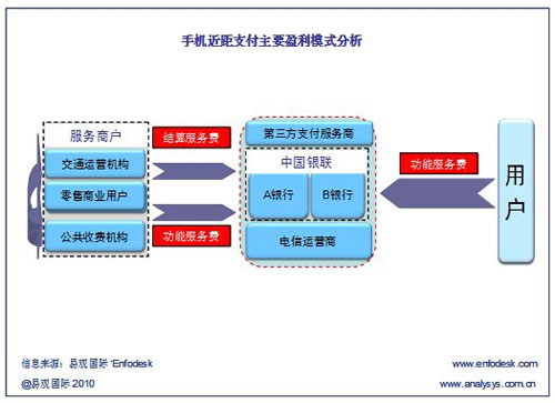 根據(jù)Enfodesk易觀智庫近期發(fā)布的《中國手機支付市場系列專題報告2010——近距支付》報告顯示,手機近距支付的主要盈利模式只有三種:即前向用戶服務費、結算手續(xù)費和后向商戶服務費。