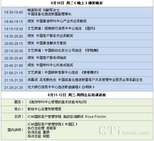 CTI論壇(ctiforum)8月3日消息(記者 潘婷婷):“第八屆中國呼叫中心產(chǎn)業(yè)高峰論壇暨第八屆中國最佳呼叫中心及最佳管理人頒獎大會”定于2010年8月10日在上海國際貴都大飯店召開。此次大會是由中國信息化推進(jìn)聯(lián)盟客戶關(guān)系管理專業(yè)委員會主辦,ICMI國際客戶管理學(xué)院(中國區(qū))承辦。通過本次大會,與會者將獲得中國最佳呼叫中心實(shí)踐經(jīng)驗(yàn)和最佳解決方案的分享,與業(yè)界精英共話呼叫中心和客戶關(guān)系管理的未來。