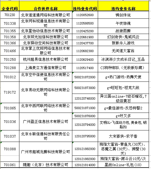 依據(jù)省移動公司上報(bào)調(diào)查發(fā)現(xiàn),下列合作伙伴存在違約行為,依據(jù)《中國移動游戲業(yè)務(wù)合作伙伴信用積分管理辦法V2.0》,處理如下: