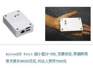 日本C-Borne公司發(fā)布了世界上最小的IP-PBX產(chǎn)品ActiveSIP Petit,采用Asterisk(米國Digium,Inc.開発),具備昂貴的專有PBX所有功能。這款比手掌還要小的IP-PBX設(shè)備適合小型辦公室和商店使用,可以通過網(wǎng)絡(luò)更新配置和設(shè)置,無需專業(yè)IP人士也可以搭建IP-PBX環(huán)境。利用楽天株式會社的Fusion通訊服務(wù),將大大降低成本電話費和電信設(shè)備投資。