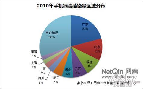 感染地域方面,《2010年中國大陸地區(qū)手機安全報告》指出,2011年我國廣東地區(qū)以21%的感染比例,成為手機病毒的感染重災區(qū),北京,上海,福建、江蘇等地位居其后。沿海發(fā)達地區(qū),已成為手機病毒的感染重災區(qū)。