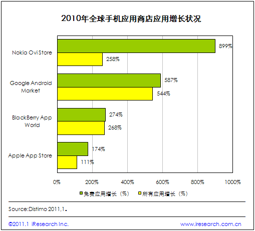 iResearch艾瑞咨詢整理Distimo最新公布數(shù)據(jù)發(fā)現(xiàn),2010年全球手機應(yīng)用商店免費應(yīng)用大幅增長。數(shù)據(jù)表明,諾基亞Ovi Store免費應(yīng)用增長速度最快,增長率為899%,谷歌Android Market和RIM的BlackBerry App World次之,增長率分別為587%和274%.