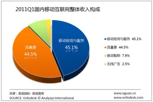 從2011年第1季度移動互聯(lián)網(wǎng)收入構(gòu)成,我們發(fā)現(xiàn)移動應(yīng)用與服務(wù)仍然是主要營收,占總體市場的45.13%。而流量費(fèi)依然占據(jù)44.45%的份額。而移動購物,無線廣告營收占比增長有限,分別占7.89%和2.52%。