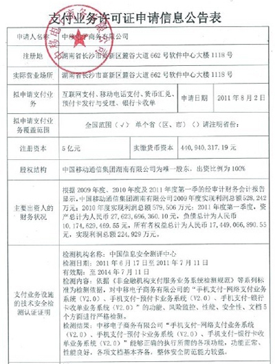 中國移動通信集團湖南有限公司(下稱湖南移動)已于昨日遞交了“支付業(yè)務許可證”申請。