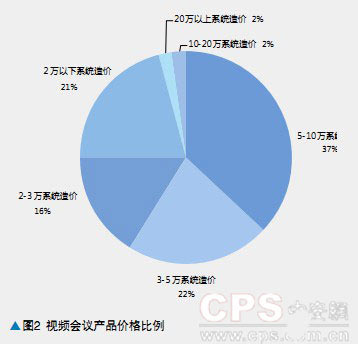 從產(chǎn)品價(jià)格上看,37%的視頻會(huì)議系統(tǒng)的每套價(jià)格在5-10萬之間,22%的視頻會(huì)議系統(tǒng)的每套價(jià)格在3-5萬元之間,另外,2-3萬/每套以及1-2萬/每套的視頻會(huì)議系統(tǒng)占據(jù)16%和21%。而價(jià)格在每套10萬以上的高端視頻會(huì)議系統(tǒng)占比不到5%。