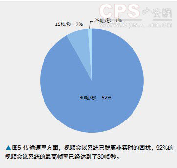 從最大圖像分辨率來看,有39%以上的視頻會(huì)議系統(tǒng)采用1024×768分辨率,另外有24%的視頻會(huì)議系統(tǒng)采用1280×1024分辨率,而704×576分辨率的視頻會(huì)議系統(tǒng)占比為19%。更低分辨率的視頻會(huì)議系統(tǒng)的占比不到20%。這說明向高清分辨率發(fā)展是視頻會(huì)議系統(tǒng)的主流。