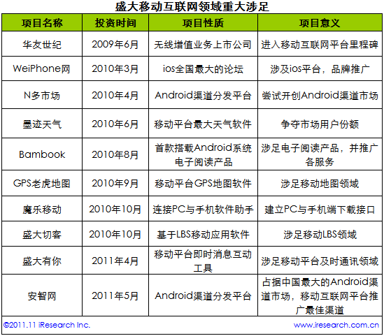 根據(jù)艾瑞咨詢整理的數(shù)據(jù)認(rèn)為,盛大一向秉持這“產(chǎn)業(yè)布局比產(chǎn)品開發(fā)更重要”的想法,縱觀盛大在幾年中對移動互聯(lián)網(wǎng)的產(chǎn)業(yè)鏈建立,投資及開發(fā)項目可謂是星光奪目。
