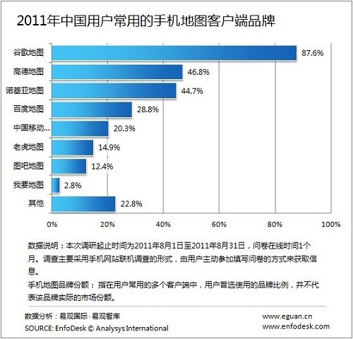 CTI論壇(ctiforum)11月25日消息(記者 潘婷婷): 據(jù)EnfoDesk易觀智庫最新發(fā)布的《2011中國手機地圖導(dǎo)航用戶調(diào)研報告》顯示,谷歌地圖、高德地圖及諾基亞地圖分別以87.6%、46.8%及44.7%的份額,占據(jù)2011年用戶最常用的手機地圖客戶端品牌份額(指在用戶常用的多個客戶端中,用戶首選使用的品牌比例,并不代表該品牌實際的市場份額,實際市場份額參見《2011年第3季度中國手機地圖客戶端市場監(jiān)測報告》)前三名的位置。