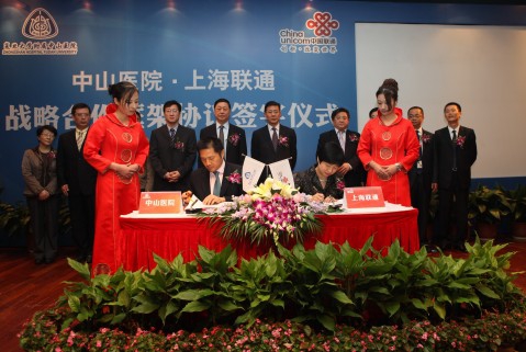 圖:中山醫(yī)院秦新裕書記、樊嘉副院長、汪昕副院長以及上海聯(lián)通蔡全根總經(jīng)理出席簽約儀式