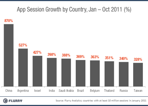 北京時(shí)間11月3日消息,據(jù)國(guó)外媒體報(bào)道,日前,移動(dòng)應(yīng)用分析網(wǎng)站Flurry發(fā)表分析文章稱,iOS和Android移動(dòng)應(yīng)用的下載量不斷增加,而中國(guó)的移動(dòng)應(yīng)用下載量和新應(yīng)用需求更是迅猛增長(zhǎng),中國(guó)已經(jīng)一躍成為全球第二大移動(dòng)應(yīng)用市場(chǎng),全球應(yīng)用開(kāi)發(fā)者都不可忽視中國(guó)市場(chǎng)。