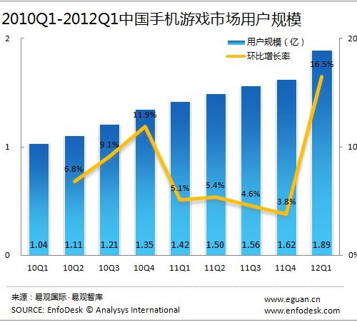 根據(jù)EnfoDesk易觀智庫產(chǎn)業(yè)數(shù)據(jù)庫最新發(fā)布的《2012年第1季度中國手機(jī)游戲市場季度監(jiān)測》數(shù)據(jù)顯示,中國手機(jī)游戲用戶規(guī)模穩(wěn)步增長,截止2012年第1季度達(dá)1.89億,環(huán)比增長16.51%。