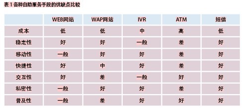 隨著電子化技術(shù)和互聯(lián)網(wǎng)技術(shù)的發(fā)展和普及,各家運(yùn)營(yíng)商都開始推出各種自助化手段分流人工服務(wù)壓力,改善用戶滿意度。主要的電子化自助手段有WEB網(wǎng)站、WAP網(wǎng)站、IVR語音交互應(yīng)答、ATM自動(dòng)柜員機(jī)。每種自助袷侄味加釁涓髯緣撓湃鋇恪?lt;br />